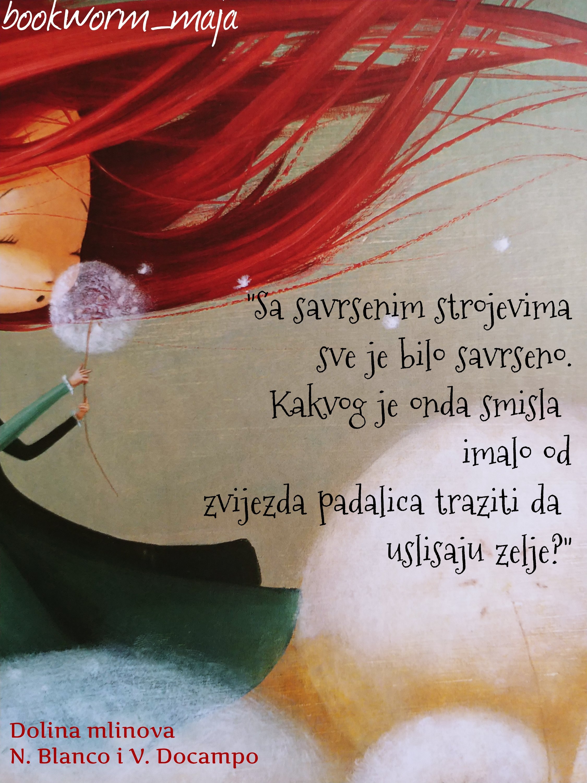 Slikovnica Dolina mlinova nam vrlo diskretno govori o tome koliko smo se okrenuli nebitnim stvarima, internetu, društvenim mrežama, spravicama uz koje smo vezani… Sve to nas udaljava od onoga bitnog- okoline, ljudi, osjećaja i živosti. Ponekad nam malo treba da se trgnemo i osvrnemo oko sebe, uživamo u malim stvarima koje nas okružuju. Ponekad nam treba da uživamo u darovima koje nam priroda i Zemlja nude. U prijateljima, sreći, cvijeću, vjetru i životu.