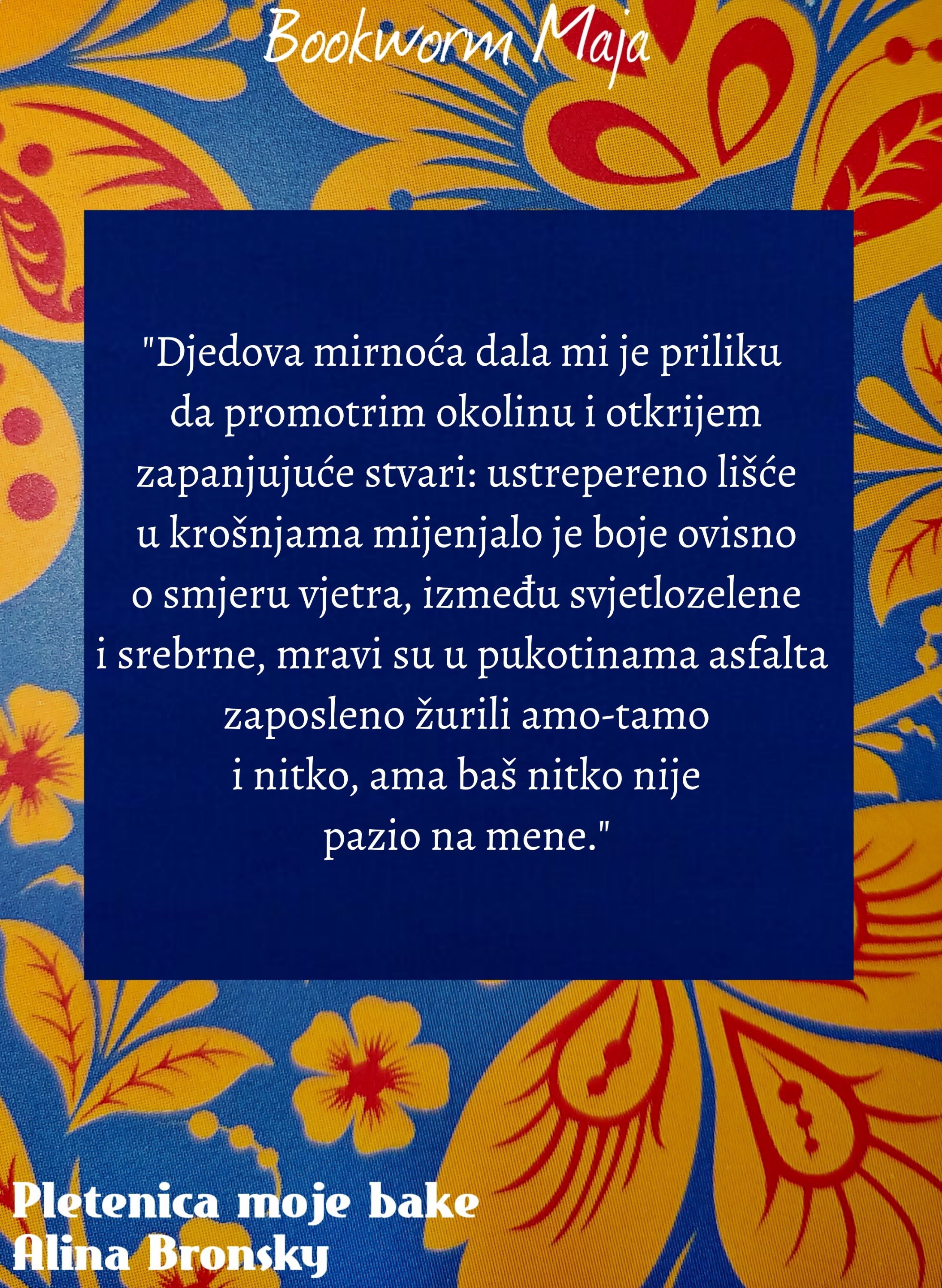 Knjigu preporučam jer je predivna i topla. Cover oduzima dah. Impresionirana sam.